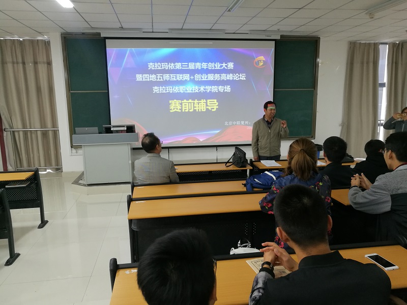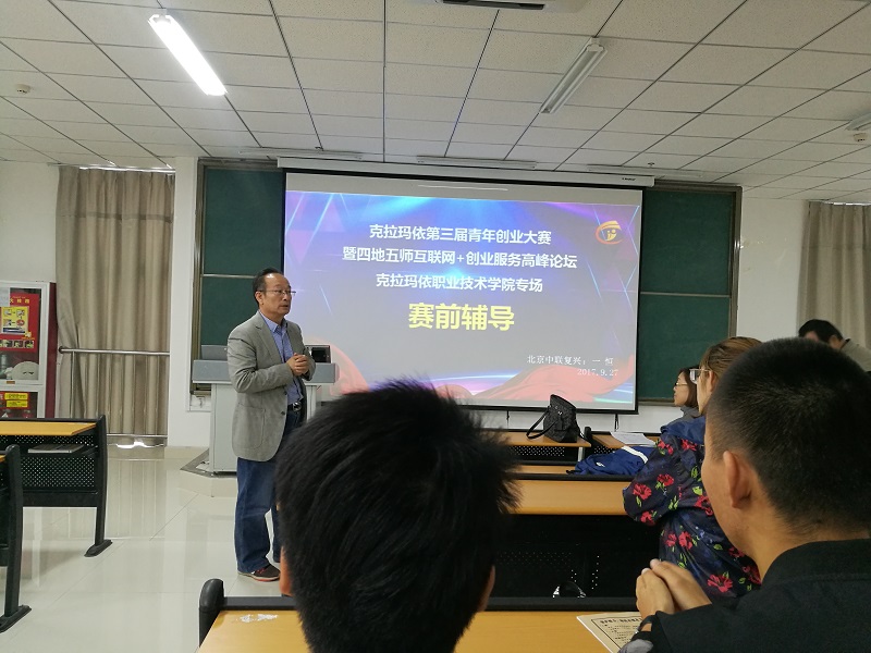 为提升我院大学生的创新创业水平,更好的参加克拉玛依市第三届青年创业大赛。9月27日下午6点,思政部组织我院参加克拉玛依创新创业大赛的学生团队参加了一次赛前培训,中联复兴(北京)科技股份有限公司总经理李建、副总经理王孝梅为学生进行了辅导,参与这次培训的还有思政部主任景四新及就业与心理教研室的教师。
