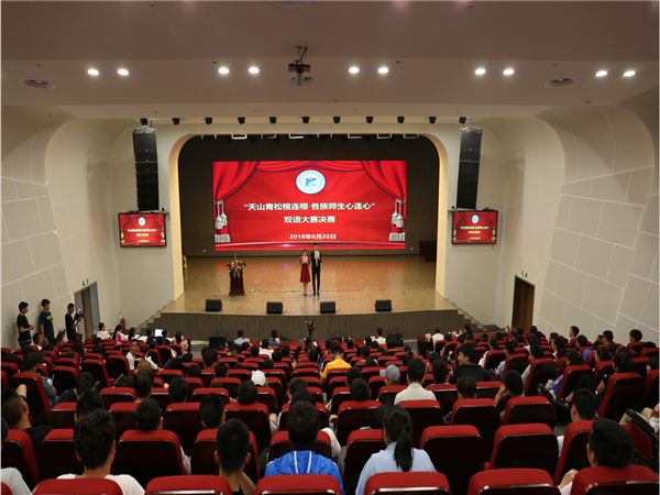 为引导各族大学生学好国家通用语言文字、树牢“五个认同”和“民族团结一家亲”意识,2018年6月26日晚21:00,克拉玛依职业技术学院在大学城J2楼学术报告厅举行“天山青松根连根,各族师生心连心”双语大赛决赛。学院党委副书记、院长付梅莉,教务处处长赵磊,基础教学部主任范瑜,学生处副处长库尔班,机械工程系副主任李继霞,基础教学部教师钟柱及柳晓明担任本次决赛评委,辅导员代表及学生代表共200余人到场观赛。